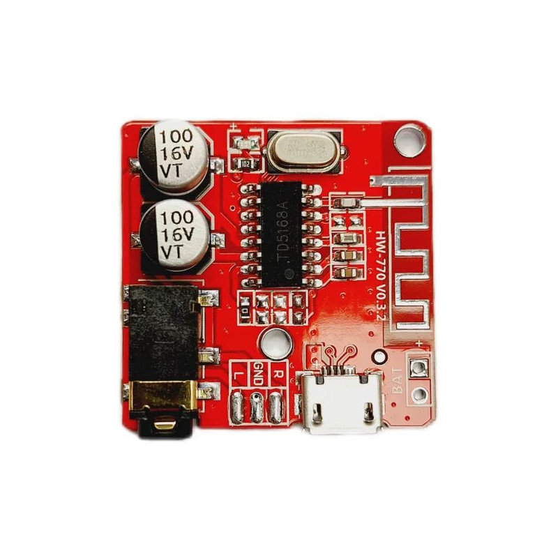 ماژول HW-770 و همچنین ماژول XY-BT-MINI هر دو یک پخش کننده بلوتوثی است. که امکان پخش فایل های صوتی از راه دور (تا فاصله 20 متر ) را فراهم میسازد. استفاده از این ماژول بسیار ساده و آسان است. خروجی پایدار، سایز بسیار کوچک و سیم کشی ساده باعث محبوبیت ماژول شده است. ولتاژ کاری ماژول بین 3.7 تا 5 ولت است. بر روی برد ماژول دو پین برای اتصال باتری و یک سوکت Micro USB قرار دارد. برای تامین تغذیه ماژول میتواند از باتری لیتیومی و یا شارژر موبایل های اندروید استفاده کنید. سه پین بر روی برد و یک جک 3.5 میلیمتری برای خروجی صدا استریو موجود است.