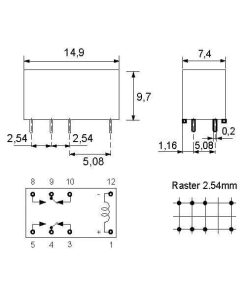 رله مینیاتوری 24VDC - یک رله 2 کنتاکت 2 آمپری با بوبین 24 ولت و 8 پین با طول 15 و عرض 8 و ارتفاع 9 میلیمتر است .