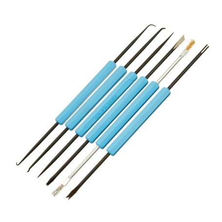 - ست ابزار لحیمکاری شامل ۶ ابزار دو طرفه برای تعمیر و بازسازی بردهای PCB طراحی شده است. این مجموعهی کاربردی، برای تعمیرکاران، مونتاژکاران و تکنسینها ایدهآل است و راحتی و کارایی بیشتری را در فرآیند لحیمکاری فراهم میکند. ابزارهای این ست شامل نگهدارنده، قلاب، چنگال، قلاویز سوراخ بازکن، لیسه، چاقوی برش، برس نرم و برس سخت میباشند که برای انجام اکثر وظایف لحیمکاری مناسب هستند. این ابزارها با کیفیت بالا ساخته شدهاند و دستگیرههای پلاستیکی آنها، راحتی و گیرایی بیشتری را برای کاربران فراهم میکنند.