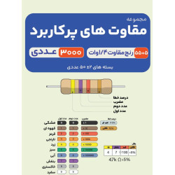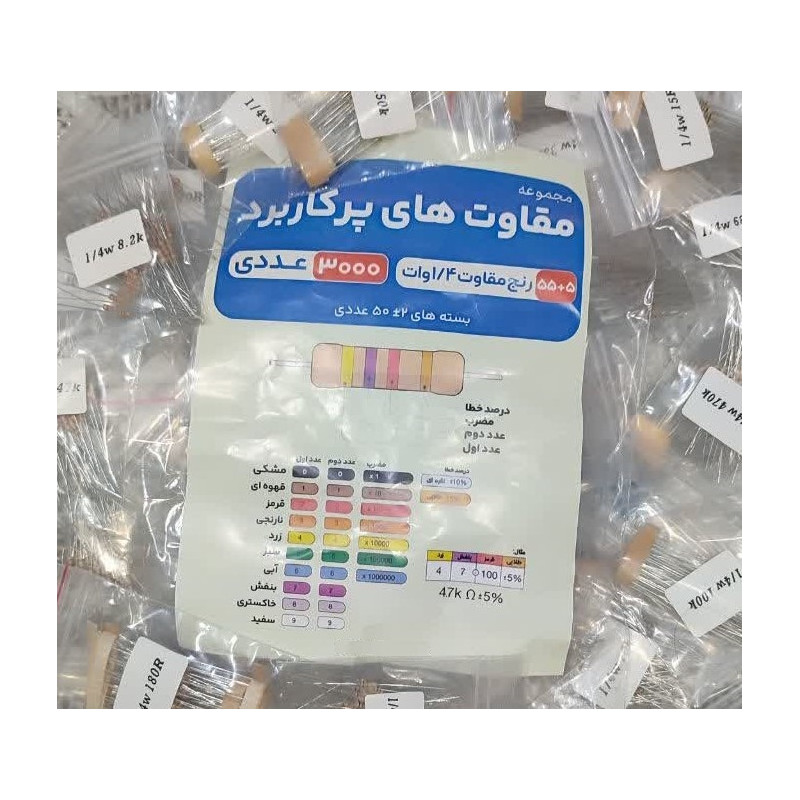 60 رنج پر کاربرد از مقاومتهای 1/4 وات هر رنج به تعداد 50 عدد بسته بندی جداگانه مجموع 3000 عدد مقاومت